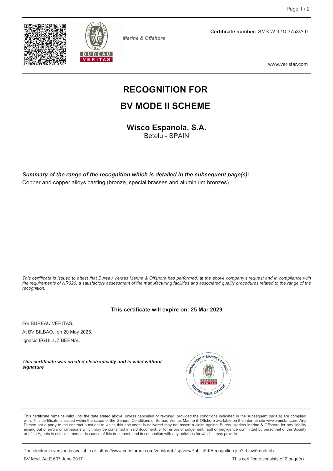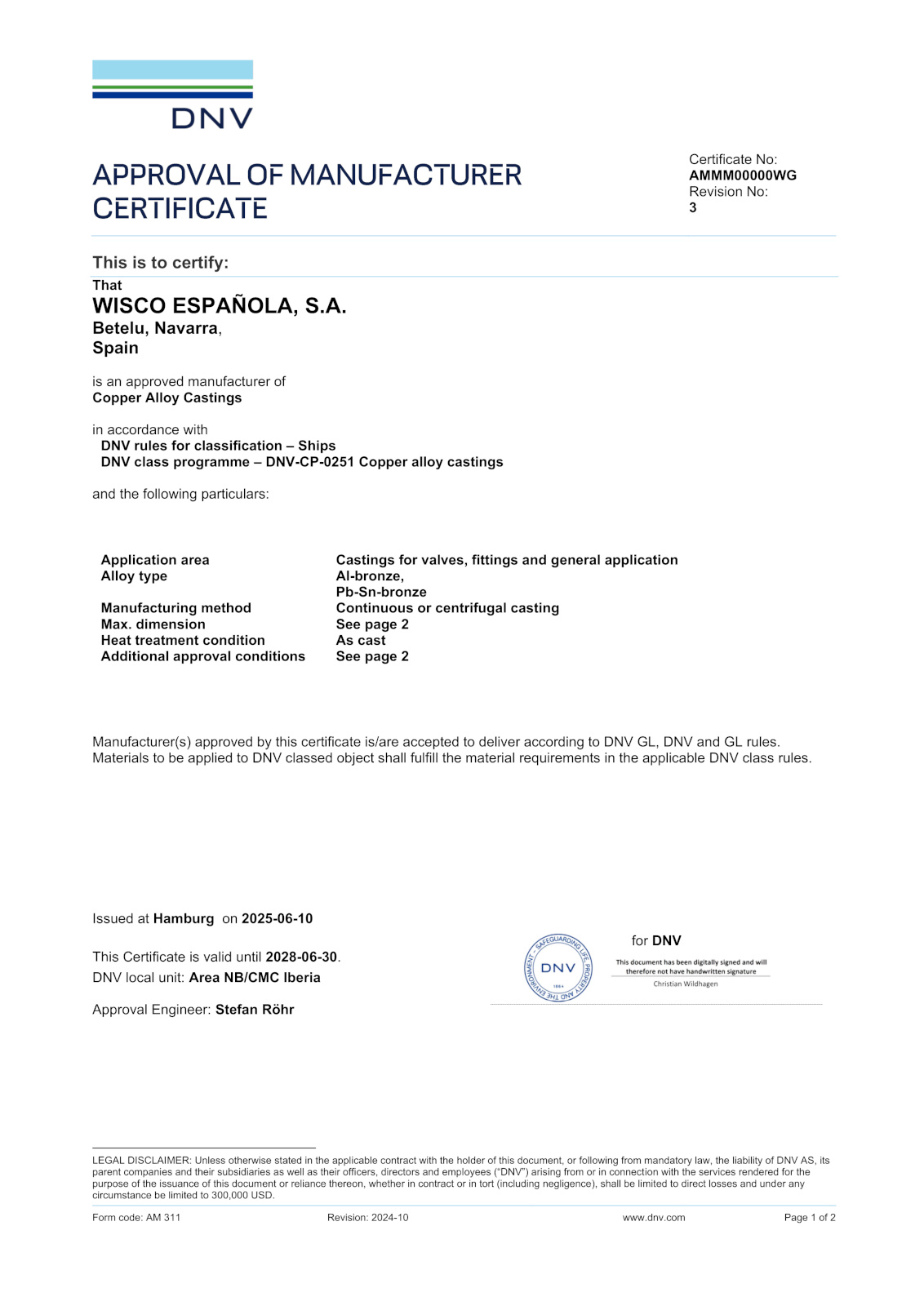 Das Qualitätssystem von WISCO wird den anspruchsvollsten Anforderungen gerecht. Dieses System wurde von der internationalen Zertifizierungsstelle LRQA unter der Nummer 10341253 sowohl für Herstellung von Gussteilen auf Kupferbasis (Bronzen, Aluminiumbronzen und komplexes Messingmaterial) als auch für die Bearbeitung zertifiziert und nach der Internationalen Norm ISO 9001 bescheinigt.